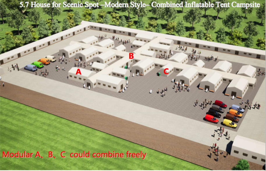 Inflatable Modular Hospital is combined by temporary moveable house, which is independently developed, designed and produced during the epidemic. As a "mobile cabin hospital", it has the advantages of convenience, efficiency, spacious internal space and good transparency. It can not only provides patients a good placement environment, but also has good privacy, which is very suitable for the placement and treatment of patients. The design of Inflatable Modular Hospital take reference to “General Hospital Architectural Design Code 2014”, and the experience of the construction of Wuhan Cabin hospital, at the equipment safety side take reference to the latest version of “Safety Specifications for Inflatable Amuseme nt Facilities” (GB / T 0; By using of our subsidiary’s patent anchor, the product’s ultimate resistance to the wind speed up to 74km/h. The material is PVC and oxford cloth , they are water proof, has EN71, REACH and ROHS test report, meet the environmental protection r equirements. We obtain the qualification of Membrane Structure Application Engineering Technology Research Center in China in 2019 , one of the few in the country.